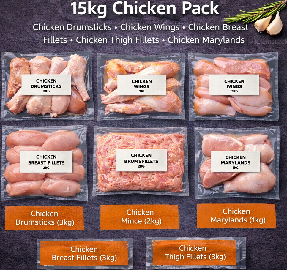 15kg premium chicken pack — fresh halal chicken, vacuum packed and available fresh or freshly frozen.